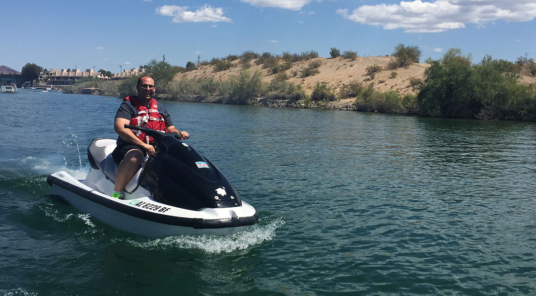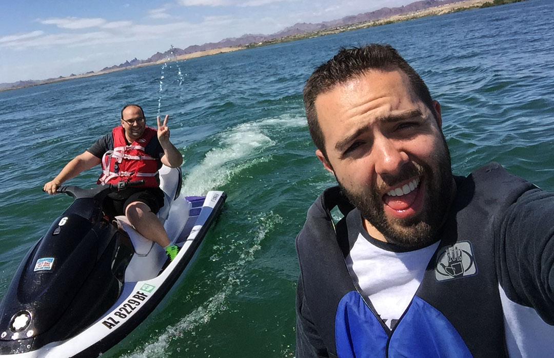 There are shops, food trucks, and other vendors along the water underneath the bridge, so we hiked down a couple flights of stairs and wandered around a little to check out the area.  James spotted a jet ski rental place so we decided to try something spontaneous and check out the pricing.  Champion Rentals offered pontoon boots and watercraft for rental by the hour. Jet skiing is something I hadn’t done for probably a decade and a half, but back in the day, my family spent a ton of time at the lake.  Here’s a picture of me in summer 1997 at Lake Powell in southeastern Utah.
