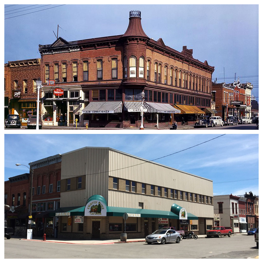 I happened to look up the Wikipedia page for Dillon, Montana while we were waiting for our burgers and the article had a historic 1942 picture of the intersection of Bannack Street & Montana Street.  “Neat pic,” I thought.  “I wonder if I could duplicate it?”  So we had a mission after to dinner to find out exactly from which angle it had been taken.   The good news:  We found the correct location.  The bad news:  The neat 1940’s architecture from the historic photo has been replaced by boring siding, and most of the decorative rooftop woodwork has been removed.  Even so, we got the picture we were after and I’ll post it here for your viewing pleasure.
