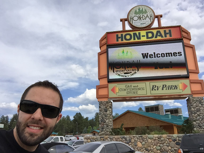 We had lunch in Show Low at Licano’s and then headed out toward the small towns of Pinetop & Lakeside. There’s a special place I needed to see at the intersection of Highways 260 & 73: Hon-Dah casino. Oh yes – of course we stopped in to check the place out. Jason tried his had at the 25 cent slot machines and scored a $15 gain after James had lost $20 in a matter if minutes. Ha! I don’t know why it’s called the Hon-Dah casino but maybe the folks on the White Mountain Indian Reservation are Honda fans.