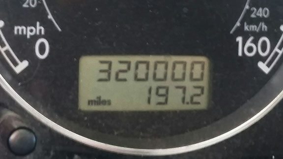 My coworker, Todd, achieved the 320,000 milestone in his Volkswagen Passat this week and sent me a photo. Congrats, Todd!