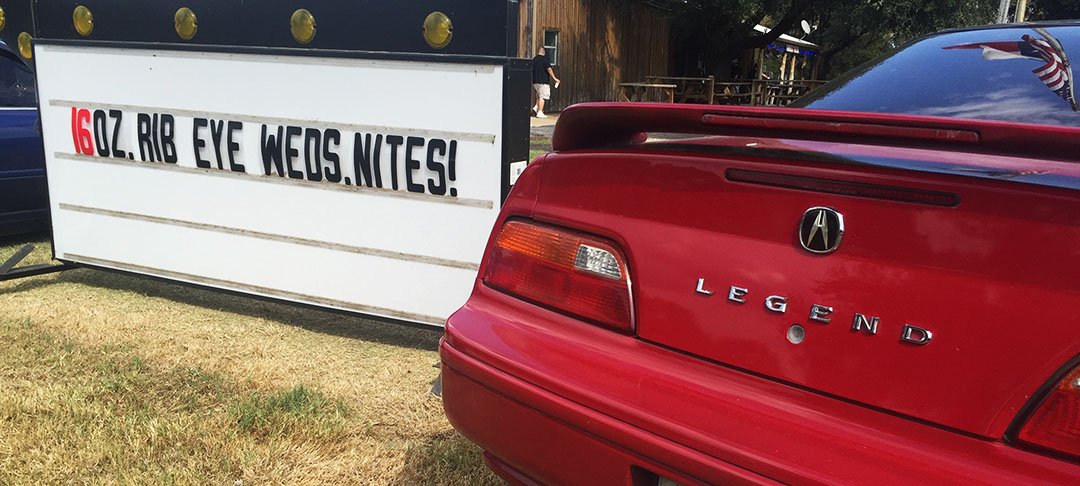 As I peer down upon the couple dozen cars in the parking lot from our room here on the 16th floor of the Marriott host hotel in Katy, I see some tired cars and some tired people.  It’s been an action packed but very enjoyable day.  Gabe has his 1993 Legend coupe up on a jack stand to address some wiring issues.  Jeff is finishing up a concours-level detail job.  And a few people are unloading stuff from their cars after today’s couple-hundred-mile driving adventure through the Sam Houston Forest.  It was a sight to behold to participate in a convoy of Legends as we visited some photo opportunities and dined on some of the best ‘cowboy grub’ I’ve ever had.