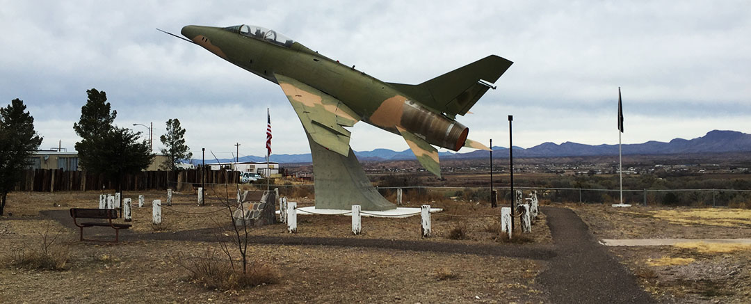 Next we rolled up to a park that at one time was probably the pride of the town. In 1998, a jet fighter plane was perched on top of a hill just south of town in recognition of the men and women of the Armed Forces who had served from the Duncan area. Today, the park is in a sort of disrepair. The adjacent swimming pool looks like an algae breeding ground, and the landscaping looks like it hasn’t seen much attention in awhile. Still, we got a good overview of the valley from there and the winding Gila River in the distance.