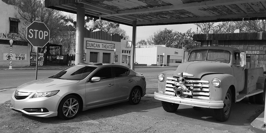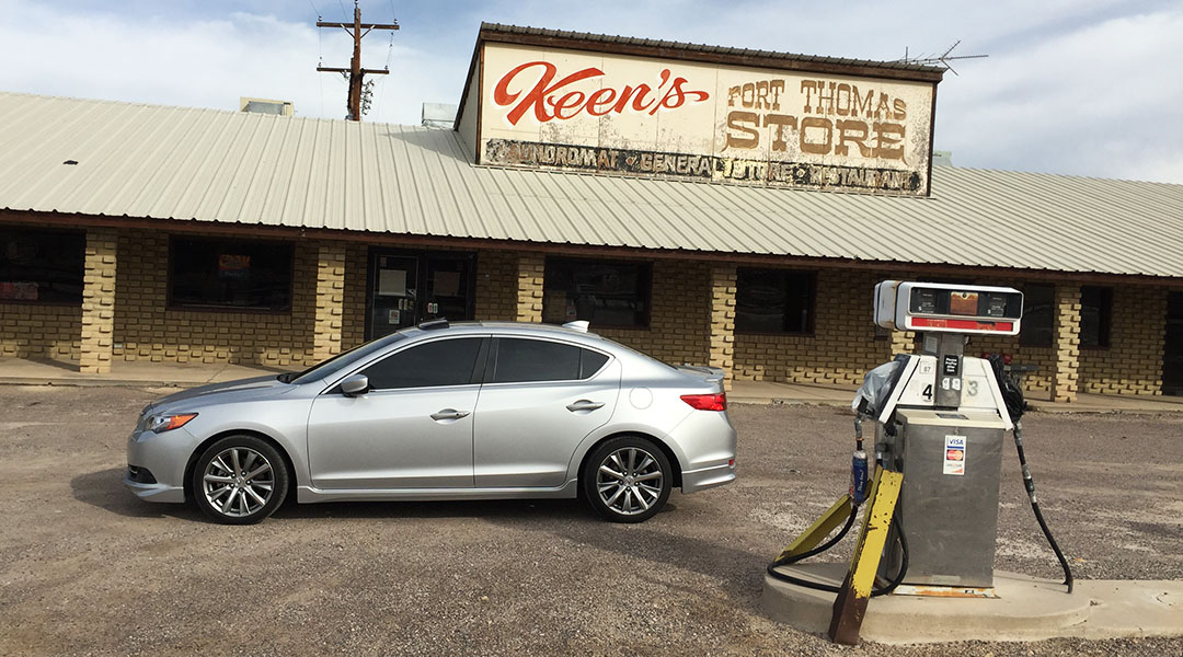 In Globe, I cut to Highway 70 and continued heading toward New Mexico. I rolled on a two-laner through the San Carlos Apache Indian Reservation which covers 1.8 million acres in eastern Arizona. No reservation would be complete without a casino or two, and I exercised restraint by not stopping at the Apache Gold Casino Resort, lined extravagantly with palm trees that looked very out of place in this barren landscape. I also was tempted to make a stop at the “Rock-A-Buy” rock shop on the roadside, but decided to press on. I arrived in Duncan at 11:58 in the morning, just in time to pull my Acura ILX into Bart Tipton’s Saloon – long since boarded up – for a photo next to a 1950’s Chevy fire truck that probably hasn’t moved in quite some time now.
