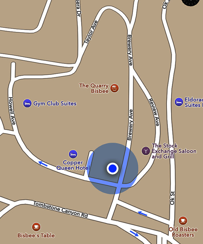 The time was about 7:30 p.m. and we’d just pulled up – tired and ready to settle in – from a 3.5-hour drive from the Phoenix area.  We were standing at the door to the historic 1902 Hotel San Ramon in teeny Bisbee, Arizona just 9 miles north of the Mexican international border.  And there was nobody there to let us in.