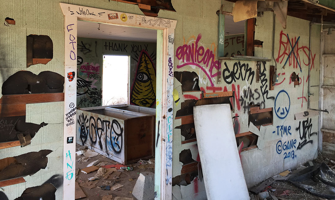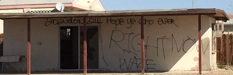 Graffiti in Bombay Beach: “Abandon All Hope Ye Who Enter.”