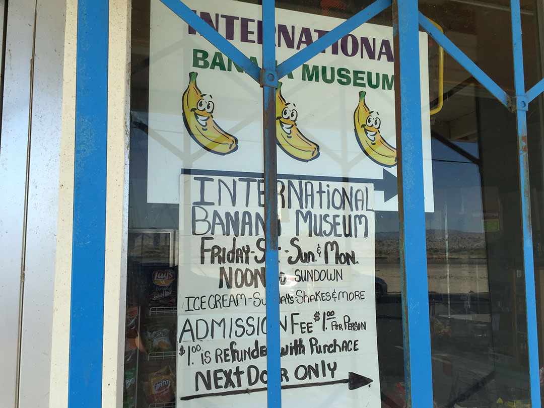 Sadly, the International Banana Museum – which really appeared to be no more than a convenience store with a little building attached – was shut down when we pulled up. From the looks of the bars over the windows, it felt more like a prison of some sorts. A typewritten note was taped to the front window stating that the hours were 12:00 p.m. to dusk, so I guess we missed that opportunity since it was only about 9:00 a.m. At least it saved us the $1 admission fee.