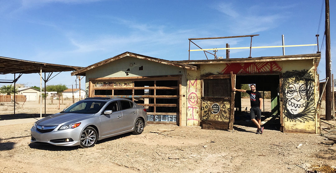 Our attention was quickly drawn to the ruins we were passing. There were abandoned homes lining the street with elaborate graffiti paintings all over them. I backed the ILX into one driveway of a home that looked almost move-in ready. NOT.
