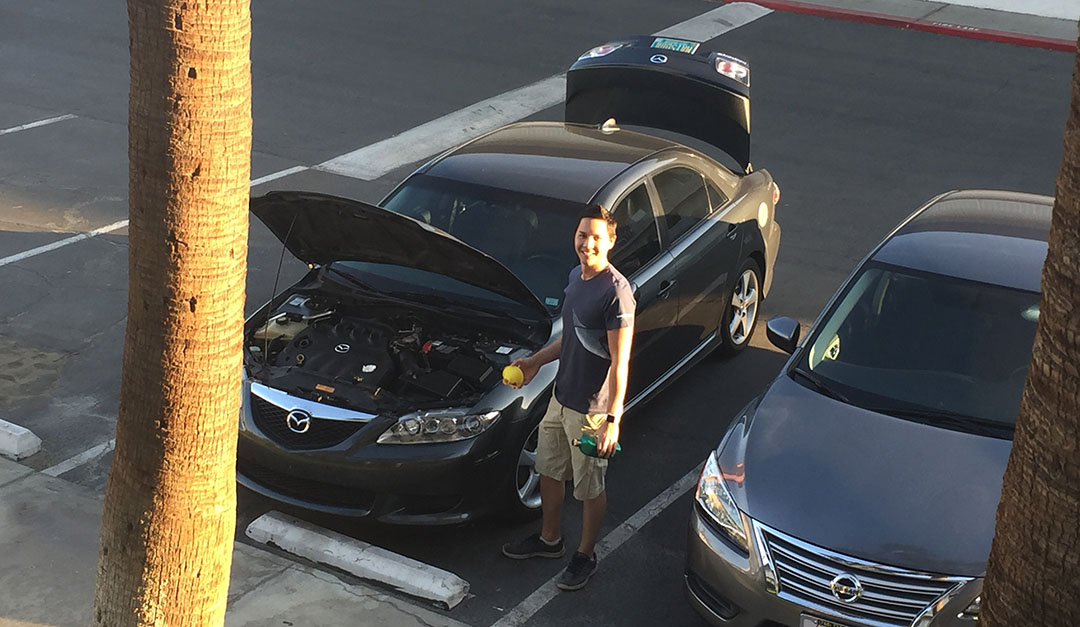 Jason checking his oil in the 187,000 mile 2004 Mazda 6 on Saturday morning pre-departure.