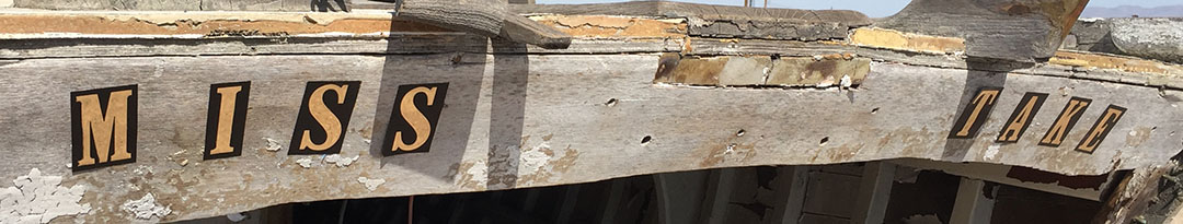 We drove up over a dike and to the beach which had a wooden boat on a stand. The water’s edge was littered with dead fish and the flies were abundant. Allow me to introduce my new boat: “Miss Take.”