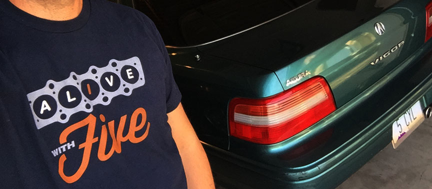Several weeks ago I bought a new T-shirt on blipshift.com that says “Alive With Five.”  It felt appropriate that I wear the shirt to a meet-up on Monday night with newfound friend Chris in Scottsdale, Arizona who happens to be an old-school Acura 5-cylinder fan just like me.