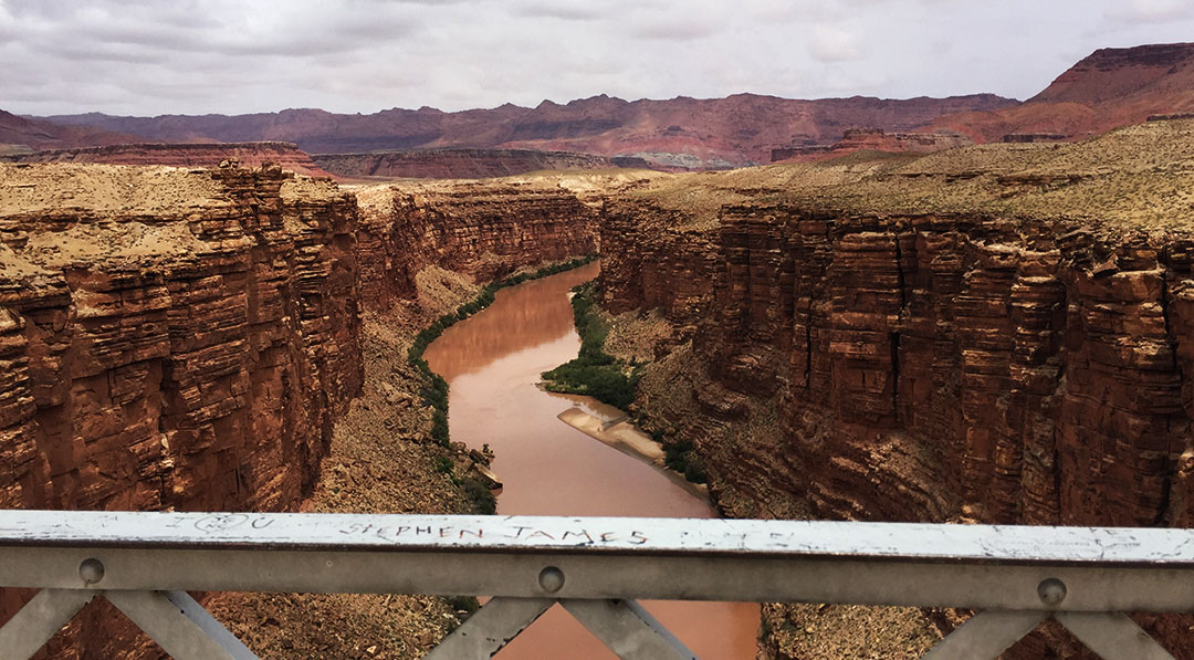 The Colorado River looked a lot like chocolate milk when we stopped briefly for a photo at the Navajo Bridge along Highway 89A about 40 miles later. The old 1928 bridge has long-since been bypassed by a newer one, but pedestrians are allowed to walk out across it so we did that to get a good view of the river below.