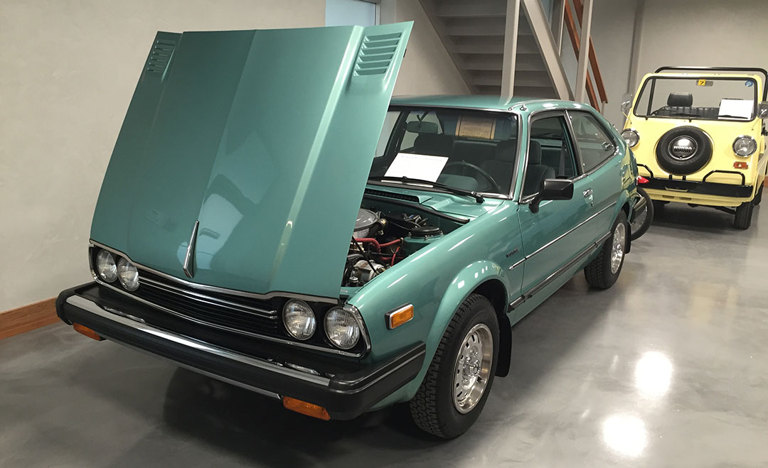 The interior space is divided into a few distinct areas: Immediately upon entering the building, the showroom greets the visitor with a highly-polished concrete floor and special signage. A glass counter showcases rare brochures and other artifacts from Honda history. And included in this area is Peter’s pride and joy – a 1981 Accord 3-door with 4,657 original miles on it. The car at 35 years old is so well-preserved it seems like it may have been teleported through time.