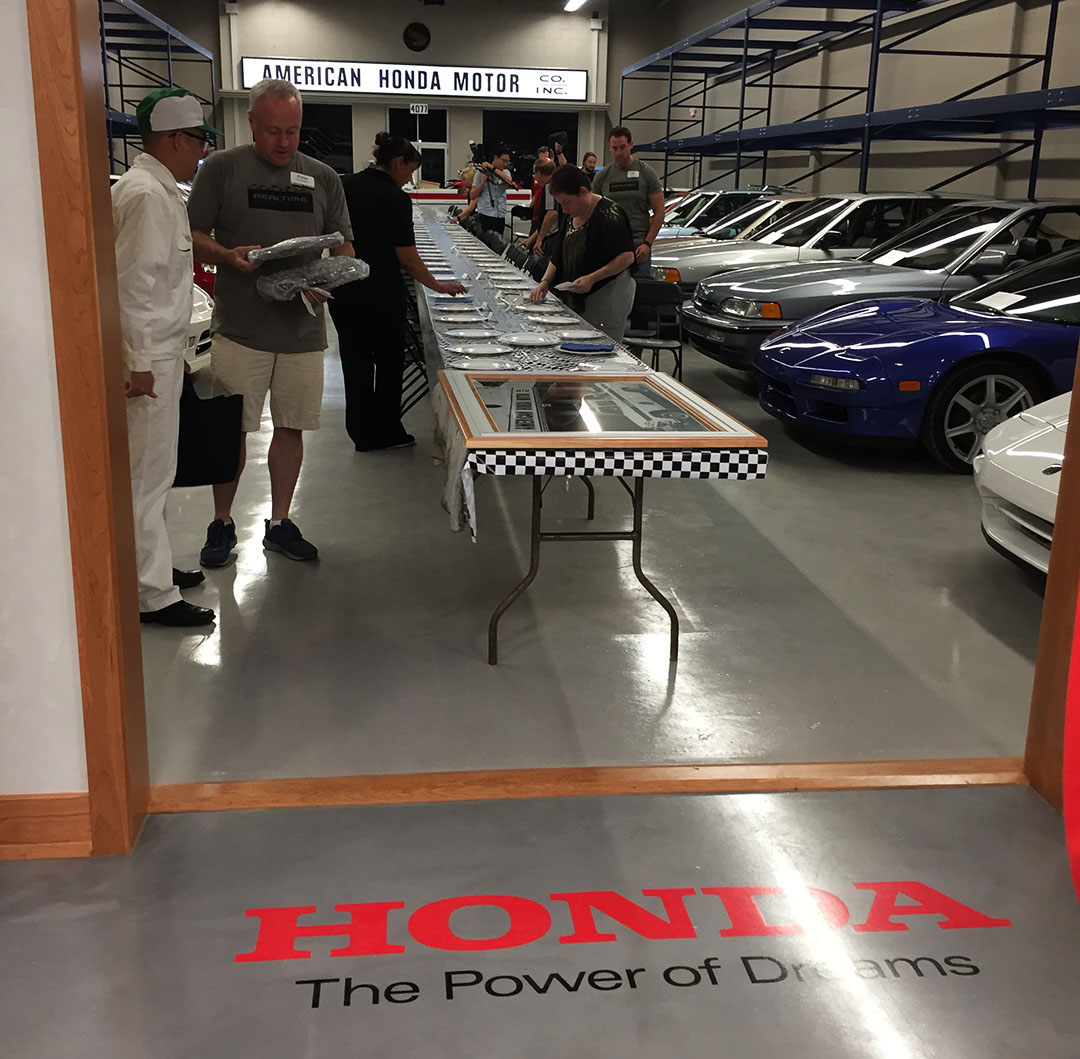 Continuing on into the first of two warehouse areas, the walls are lined with special Honda and Acura automobiles that are backed into their assigned parking spaces. For this grand opening, the center aisle was filled lengthwise with end-to-end banquet tables that had dinner seating capacity for I would guess at least 100 people.
