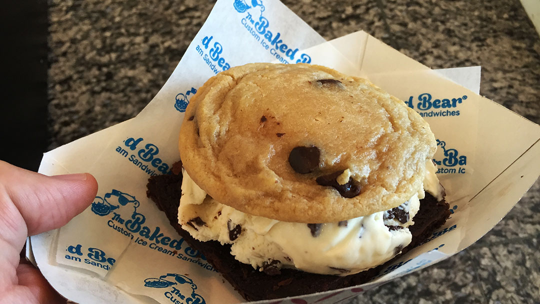 This is a “Baked Bear” ice cream sandwich. Cookie on one end, brownie on the other end, and cookie dough ice cream in the middle. TDF (to die for). Especially since the cookie & brownie were warmed up.