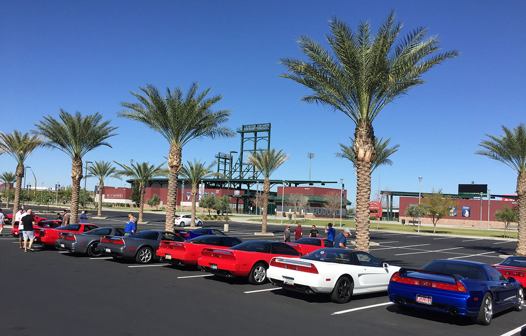 It only took us about 20 minutes to get to the meet location, which was in the parking lot of a baseball stadium on Rio Salado Parkway.  Luckily we had the place almost entirely to ourselves.  The cars kept rolling in.  Pretty soon it was 11:00 a.m. and time for Jhae to round up the troops for our roll-out en masse.  There were a couple of stoplights to navigate but pretty soon we were swarming our way northbound on Highway 87 toward Payson, Arizona on a nicely improved two-laner with 65 mph limits.  It was fun to weave through traffic seeing NSXs both ahead and in the rearview.  Some brave videographers in a Honda Pilot hung out its back window for some rolling video.