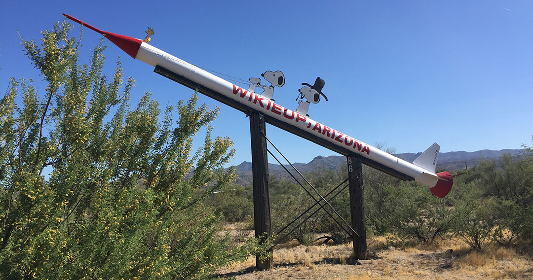 Snoopy riding a telephone pole ‘rocket’ just outside Wikieup, Arizona on Highway 93