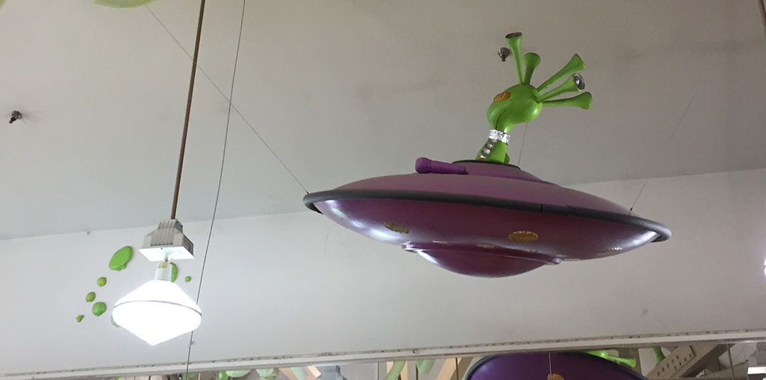 The interior of the station has the other half of the UFO, as well as a myriad of green aliens flying around in purple saucers near the ceiling