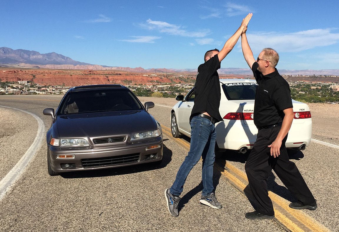 Just a week prior, I was tasked with two huge milestones of a completely different nature:  I ran the St. George, Utah marathon and I achieved that long-awaited “all-fives” odometer reading on my 1994 Legend coupe, in partnership with Josh who celebrated the same on his 2005 TSX.  It was a rollover more than a year in the making, executed with painstaking precision with the help of a half-dozen friends who wanted to be there for the occasion.  It took a lot of planning to get Josh’s car (700 miles away, in Boise) and my car (400 miles away, in Phoenix) to the same midpoint and pointed toward one another on a closed road within 2/10ths of a mile of each other.  But we succeeded.