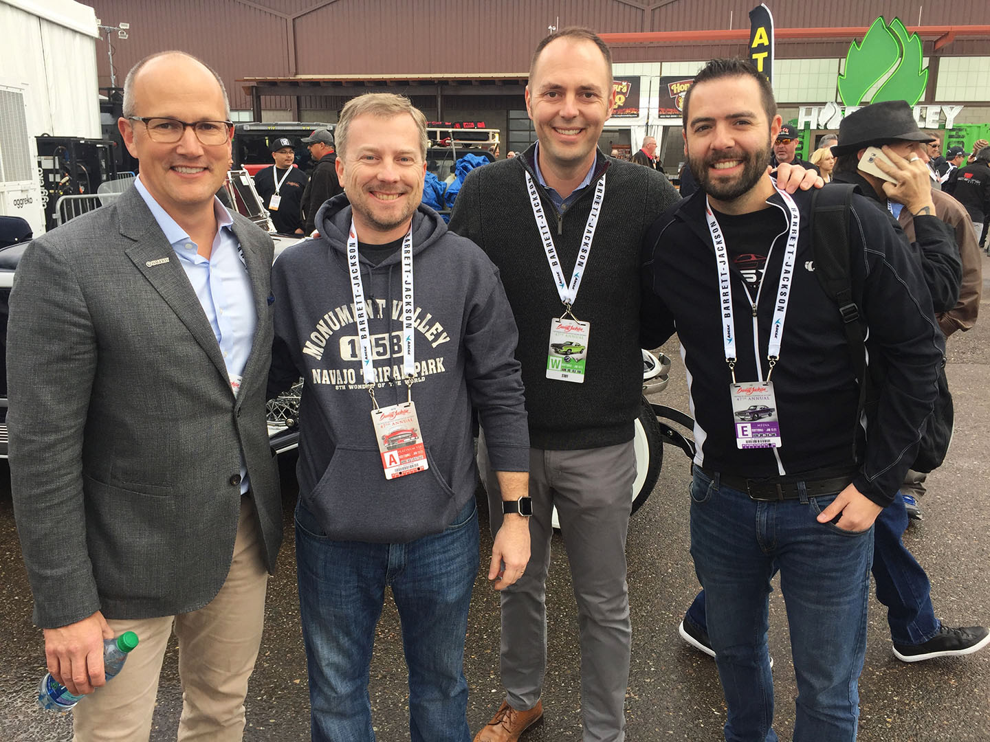 Below were the stats for Barrett’s overall results this year, courtesy of my friend Jonathan Klinger who is the Vice President of Public Relations at Hagerty Insurance.  Many thanks to him for keeping us in the loop via email on the daily happenings over at the auction block.  And thanks, too, to Hagerty’s CEO, McKeel Hagerty, for extending some heartfelt and kind words about the up-and-coming import collector car community when we ran into him right outside the auction area.  It was great to get to meet him.  Pictured here are McKeel, Chris, Jonathan, and myself.