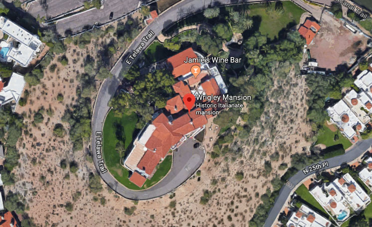Wrigley’s mansion in Phoenix (photo above from 1949), is set atop a 100-foot-tall knoll with views of the Biltmore and the community below.  Construction was completed in 1931, only a year before Wrigley died at age 70.  The mansion went on to be owned by another big wig in the food industry: Geordie Hormel, known for creating Spam (he also claimed to have invented the corn dog).  Hormel bought the Wrigley mansion as a $2.6 million 50th wedding anniversary for his wife, and restored it to his former glory.   He passed away in 2006 but the facility lives on as a private club for Sunday brunch, fancy weddings, and other special events.