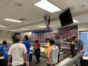 The banking around the curves is 31 degrees and to keep the paving equipment from sliding or tumbling down the bank they have equipment that runs along the perimeter roads alongside the paving machines with safety lines tethered to them.  We weren’t allowed on the banked curves but we were allowed to get out and walk the start/finish line which is banked at a mere 18 degrees but proved to be a little difficult to climb.  We also got to tour a few buildings in the infield which houses the press corps and we got a group photo taken inside Winner’s Circle.  After a short elevator ride we went up to the grandstands to get a view of the entire speedway.