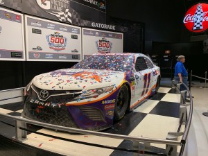 Our last stop was the Daytona Speedway Hall of Fame and Museum.  Inside the entrance is Denny Hamlin’s Toyota which won the Daytona 500 this past February. It’s tradition for the 500s winning racecar to be put on display in the museum for one year until the next 500 winner is crowned.  The car is displayed in the same condition as shown on t.v., soda, champaigne, confetti, and all kinds of asphalt and debris still clinging to the paint.  The only thing done to the car is it’s drained of any remaining fuel.  Inside the museum is the famous Hudson Hornet, cars from Dale Sr., Jeff Gordon, as well as a few funny cars, dragsters, and even a couple boats.