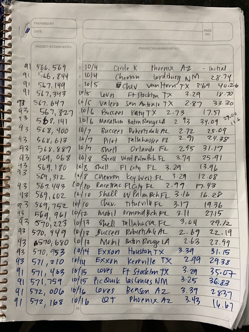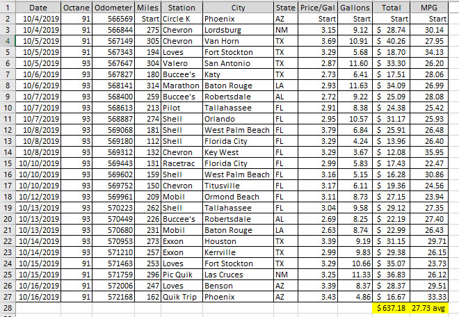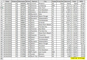You’re all asking:  How’d the car do?   Well, it delivered 27 mpg and performed pretty flawlessly for its age and miles.  The only maintenance items worth mentioning were a bottle of power steering fluid used up, a pair of new tires installed for precaution (they’d been a worn before I even left Arizona), an oil change, and replacement of a taillight bulb.  My comprehensive fuel log is posted below – totaling about $640 in fuel expense.