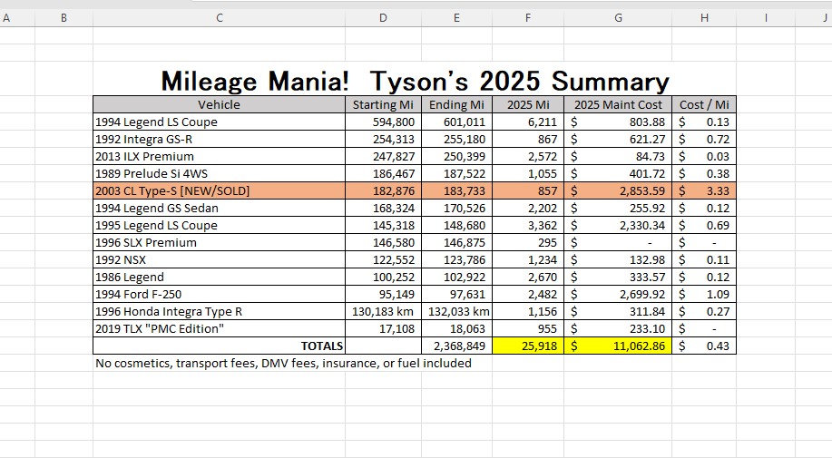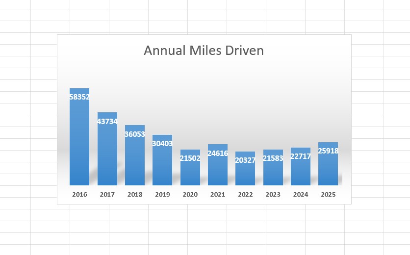 As you’ll see in the Excel grid screenshot below, I drove 25,918 miles this year and spent $11k on maintenance. My 12 current vehicles combined have 2,368,849 miles.