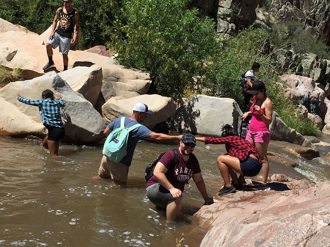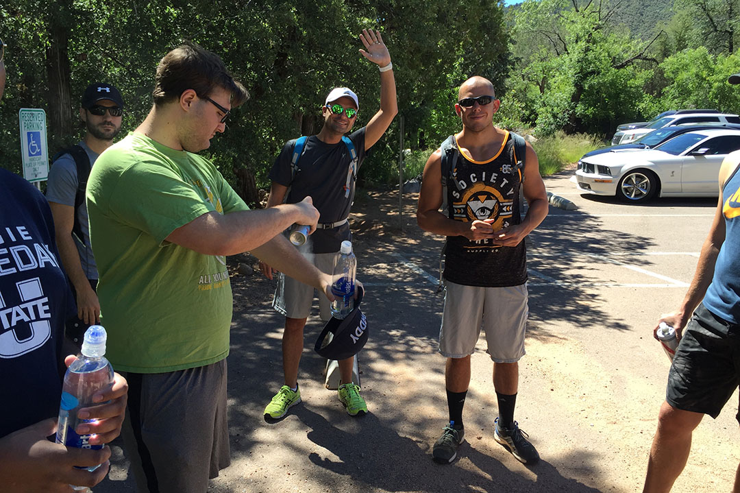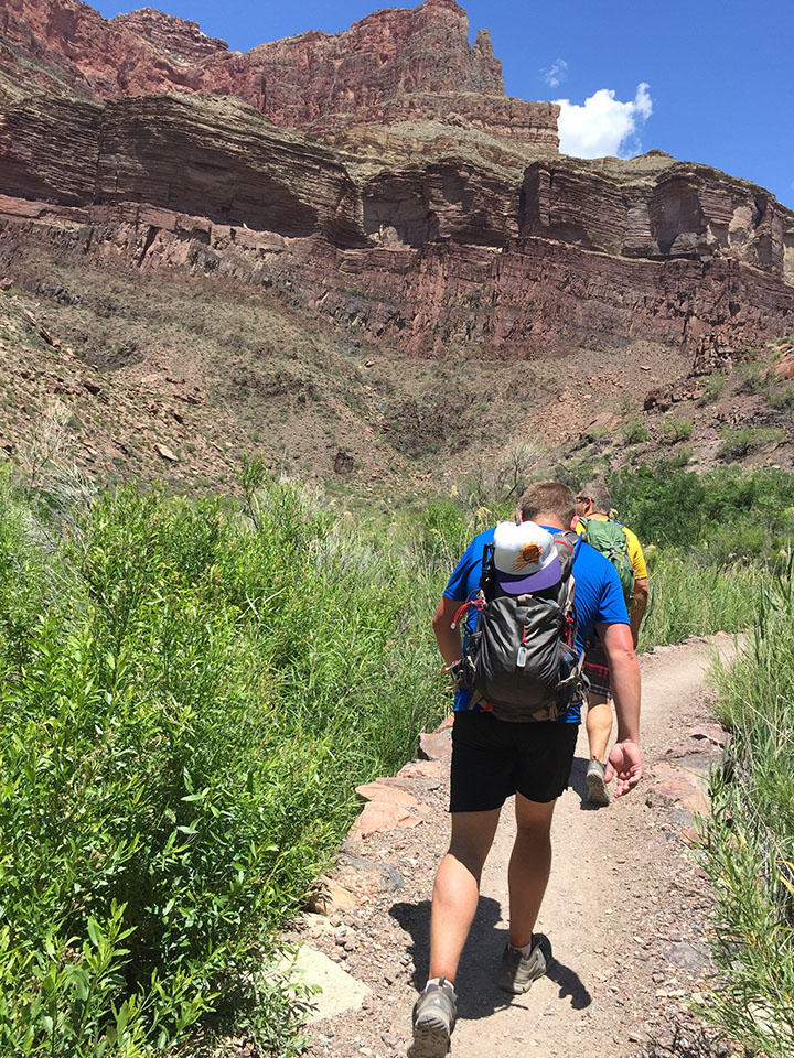 By now we were starting to wonder when we’d make it to Phantom Ranch at 2,460 feet. Notably the most “developed” of any place we’d be seeing throughout the course of the day, the lodge there has been a waypoint for Grand Canyon travelers since it was constructed in 1922. It was about 7.4 miles into our hike, and as we got closer, I could only think about one thing: LEMONADE. Inside the lodge, they sell cups of ice cold lemonade for $3.00 each. I chugged one so quickly it gave me a headache. Outside, there was a fresh water spigot for refilling water packs. The 8 of us sat around a picnic table under a shade tree and laid out some food items to refill our stomachs. Rustin pulled out a travel size bottle of Hidden Valley Ranch dressing and we all gave him a look of: “You packed that down here?”