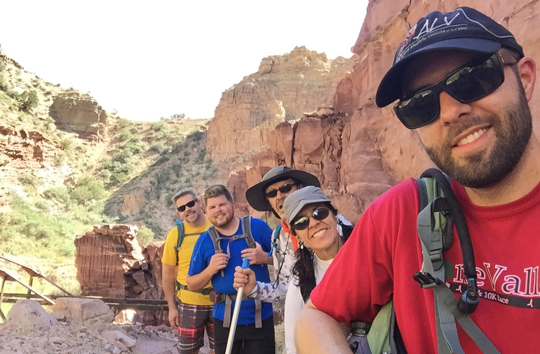 In the blink of an eye it was time for a 4:00 a.m. wake-up call. Right off the bat, anxiety ran high because we were rushed to get to the train station for a 5:00 a.m. shuttle bus. We had to make last-minute decisions on what to throw into our packs, how much water to take, and what to wear. (Some of our gear would be staying in my car rather than making the trip across the canyon on our backs.) The bus took us to the South Kaibab trailhead (elevation 7,260 feet) about 15 minutes away and we hopped out. The sight of the canyon at daybreak is something unreal. Temperatures were cool but not uncomfortable. And then began our short-lived tradition of taking a group “selfie” at one-mile intervals throughout the course of the hike. I say short-lived, because by about halfway through the day we cared very little about group pics; we were focused instead on sheer survival.
