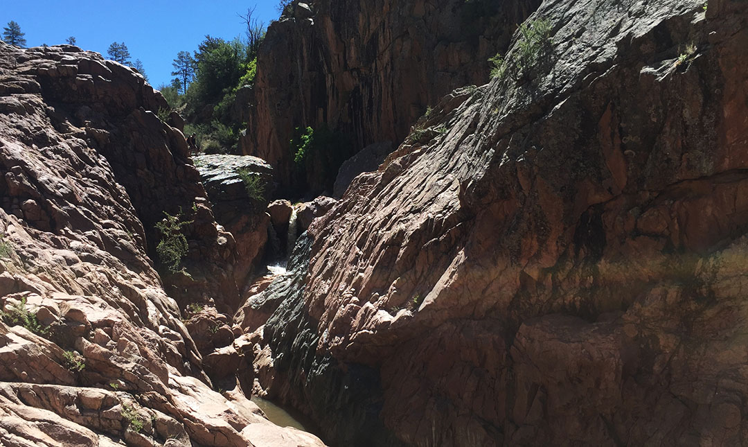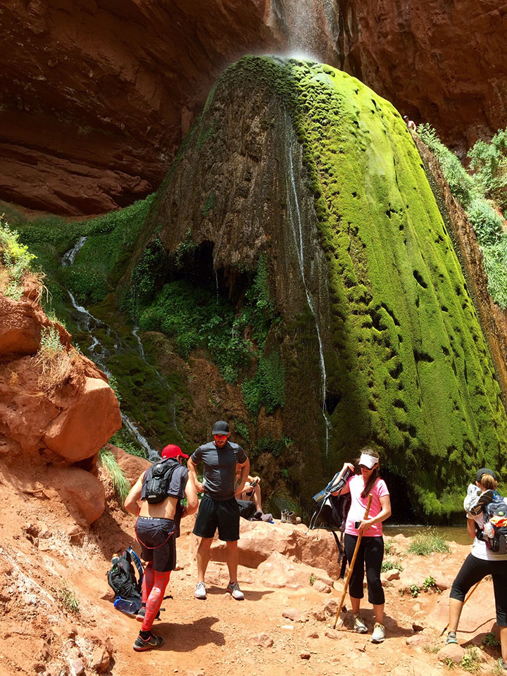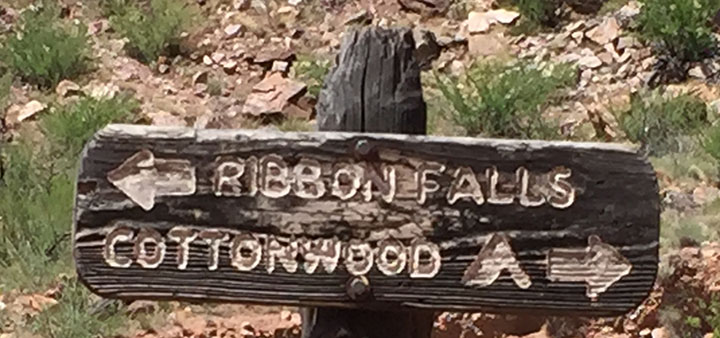 My mom had learned of a detour that was an absolute must-see called Ribbon Falls. I don’t think any of us were too keen on adding distance to our already-long hike, but multiple sources had recommended we make time for it. So, when we saw a crudely-carved wooden sign pointing us in its direction, we rallied our energy as best we could and headed toward Ribbon to check it out. We had to cross a stream and hike up some boulders to get there, but in about 20 minutes we came upon the most beautiful oasis I’ve ever seen. Misty water came down upon us from dozens of feet above where it spilled through an opening in the red sandstone. Justin quickly scampered up as high as he could go on the waterfall itself, but all I could think about was ripping my shoes and socks off to dip my feet in the water.
