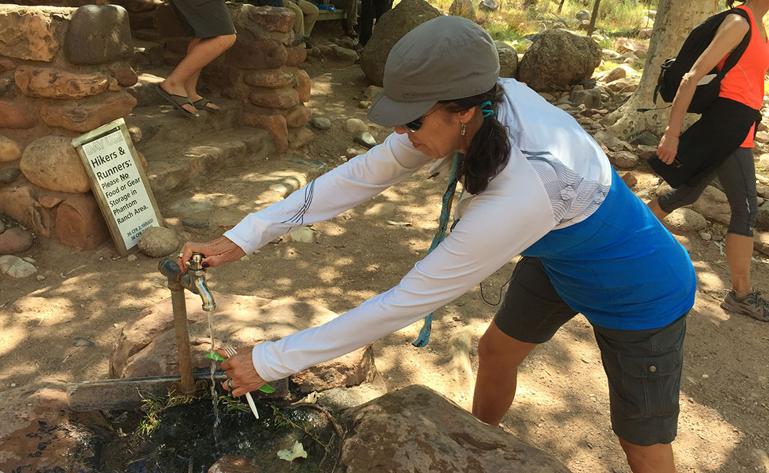 Todd had a great idea for a way to beat the heat when we got a couple of miles into our hike again. We took our shirts off and soaked them in the creek. The feeling of putting on a soaking wet T-shirt or tank top is unbelievably refreshing when you’re sweaty and gross – especially if there’s a slight wind to exaggerate the temporary chill factor. There are, occasionally, water spigots available every few miles on the trail from Phantom Ranch to the North Rim. Hikers have to be careful and plan ahead, though, because it’s possible sometimes for the water to be out of service. We lucked out and everything was in operation during our hike.