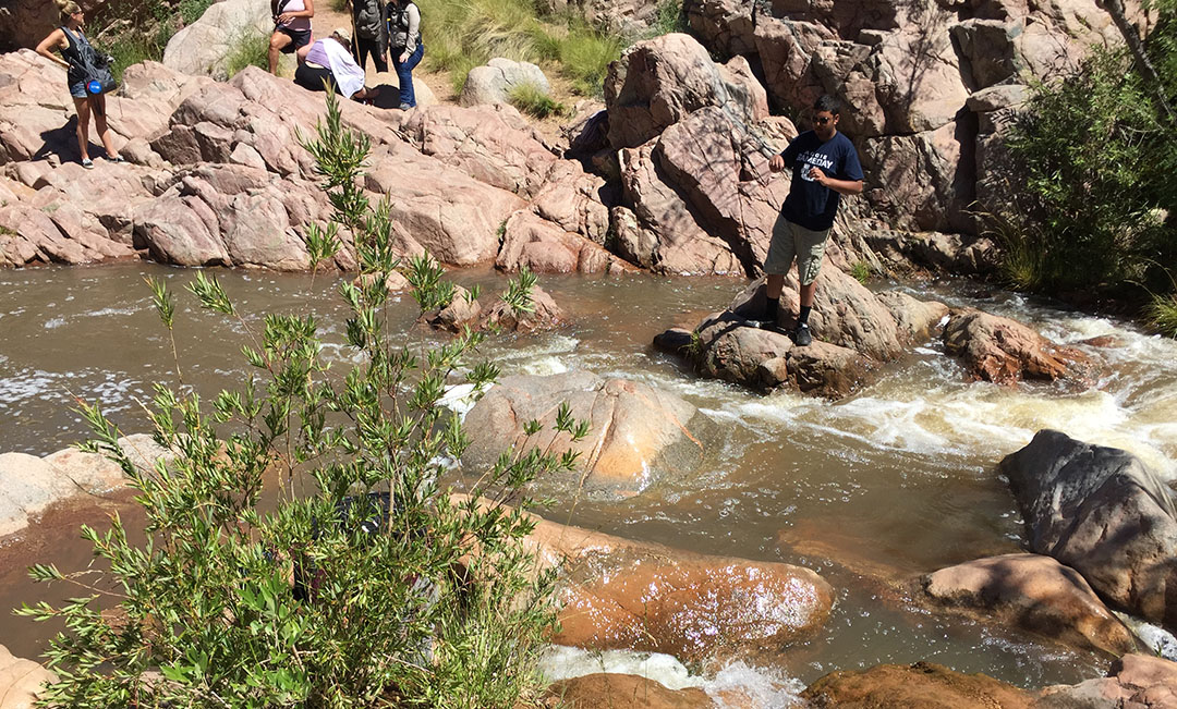 The trail ran parallel to the river for many more miles. It was about this time – probably 10:30 or 11 in the morning – when the heat started cranking up. Even though I’d lathered up in SPF50 and I was wearing a baseball cap and sunglasses, I could feel the sun cooking the back of my neck. At times we had to walk single file and at other times we stood two abreast and held conversations. Several times there were bridge crossings where the trail changed sides in relation to the river. The steady uphill grade started getting the best of me and I now started drinking more water than ever before. I could now see why on average 250 people per year are rescued from the canyon. Dehydration is a very real concern.