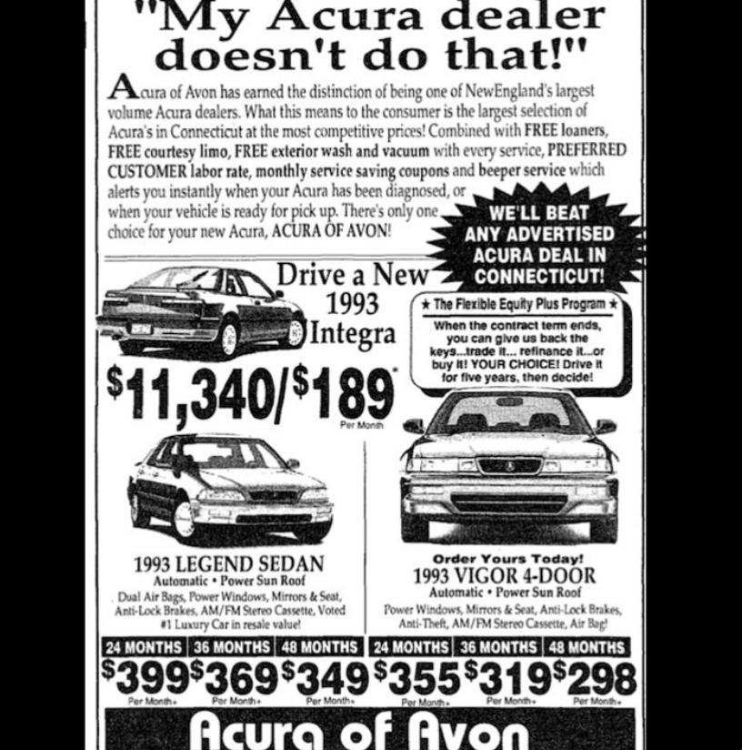 I recently created a login for Newspapers.com and started browsing the archives from the 1980s and 1990s. I dug up some particularly cool ads for Acura dealerships from back in the day.