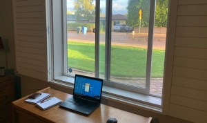 My home office is set up and I moved my desk in my bedroom so that it looks out the front window. Now, I just need a better monitor setup. Stat!