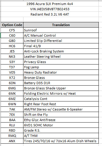 A friend (again from Instagram) connected me with a resource that was able to decode the VIN plate in the engine bay. I now know exactly what each of those ‘options’ listed at the bottom are. The summary is below in Excel.