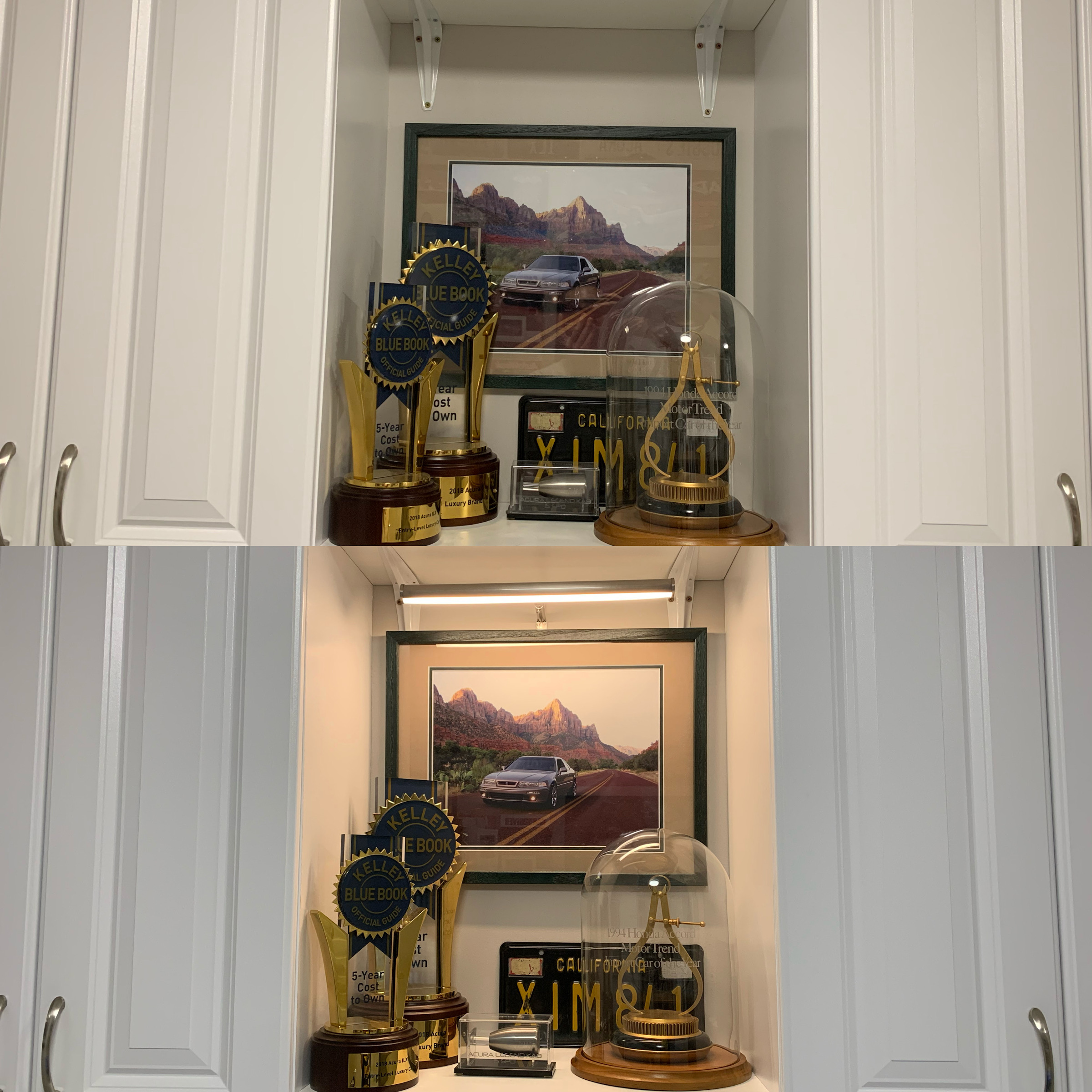 The letters came in plain black so they needed to be primed, painted, and clear coated. The whole process took a couple of weeks because I ordered all the supplies online as opposed to breaking my quarantine and going to the hardware store. Additionally, the lamp you see there was ordered on Amazon and I had to run the power cord through the garage cabinet in order to get it wired up and working.