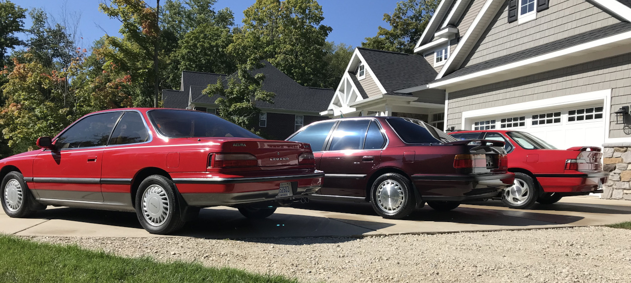 Do you all remember the Mulberry Red 1990 Accord EX I sold over a year and a half ago? It traded hands just a couple of weeks ago to a friend of mine named Brent who lives in Michigan. He has a great collection. He sent me this photo of the Accord alongside his 1990 Legend and 1990 Prelude. Talk about an epic throwback trio.