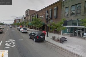 The address provided by Google for the flying saucer did not take me to it. But I got on aerial maps and found it just a little further down the street ahead of me. My location at left, saucer at right, circled.