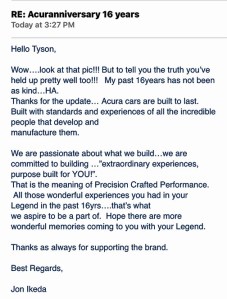 I also heard from Acura General Manager, Jon Ikeda, who wrote a very nice and meaningful email about how proud he is of the vehicles themselves as well as the people who manufacture them. This guy knows what’s up!