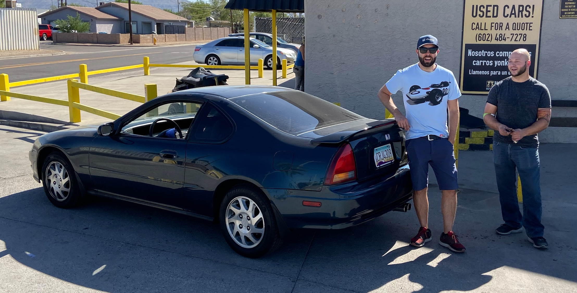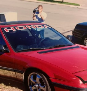 These pictures show my friend Branson holding a camcorder and recording the scene. We were looking at my then-wrecked (former) Prelude at a salvage yard in St. George, Utah. We just happened across the car coincidentally. I’d sold it about four years prior, and the new owner was rear-ended which ultimately was the demise of the car. To this day I still have the rear “H” emblem off the trunk lid in my display case at home.