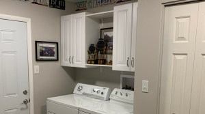 The letters came in plain black so they needed to be primed, painted, and clear coated. The whole process took a couple of weeks because I ordered all the supplies online as opposed to breaking my quarantine and going to the hardware store. Additionally, the lamp you see there was ordered on Amazon and I had to run the power cord through the garage cabinet in order to get it wired up and working.
