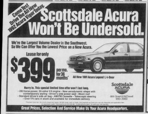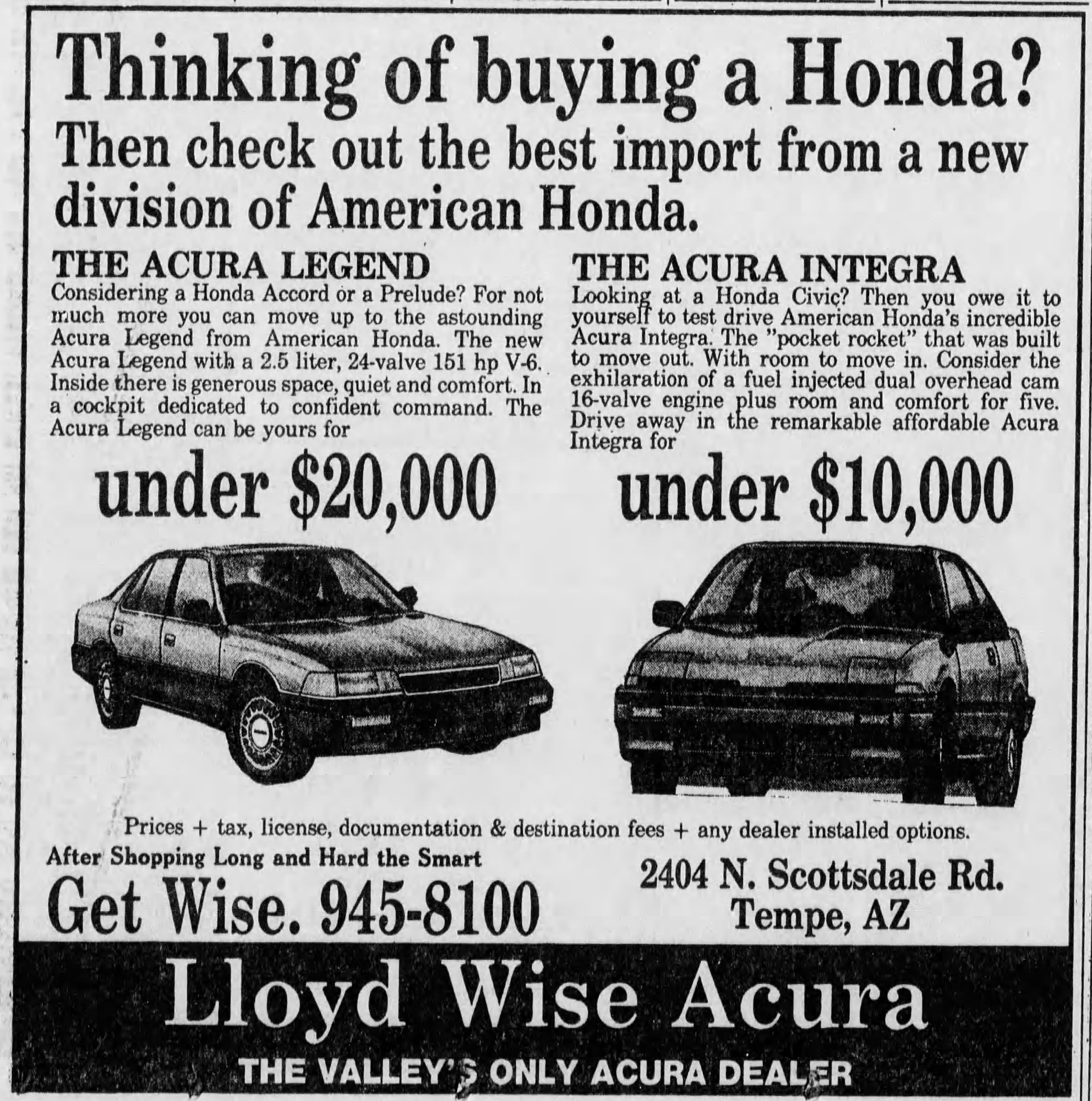 I recently created a login for Newspapers.com and started browsing the archives from the 1980s and 1990s. I dug up some particularly cool ads for Acura dealerships from back in the day.
