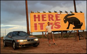 From there our next roadside attraction must-see was Jackrabbit Trading Post just west of Winslow, Arizona. This relic of old Route 66 is still in business (though it was closed for the day when we rolled past). The noteworthy “Here It Is” sign is a symbol of history and was featured, for example, in the original Cars movie set in Radiator Springs. A definite highlight of tonight’s trip was when the theme song for an old cartoon, Tiny Toon Adventures, came on my iPod. Kevin and I both belted the words without missing a beat at full volume. That definitely dated us both. Left me laughing for a few minutes.