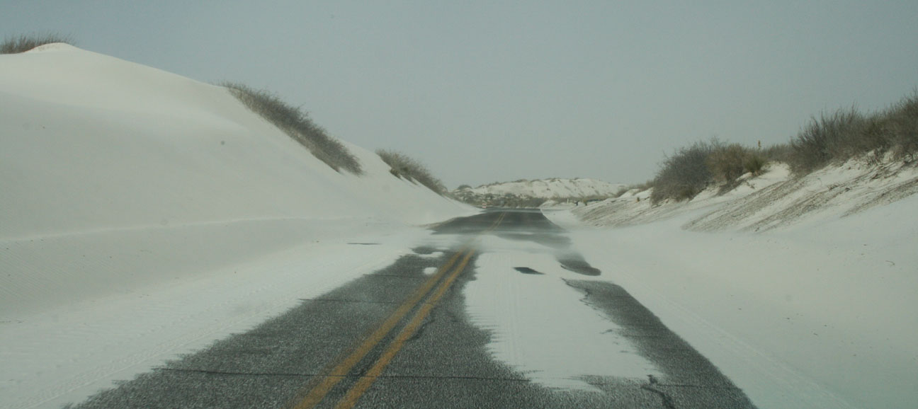 The two-lane highway headed north into the monument area. Heavy winds had pushed sand across the roadways. Chris told me that they actually use sand plows to move it out of the way as necessary. It looks a lot like snow!