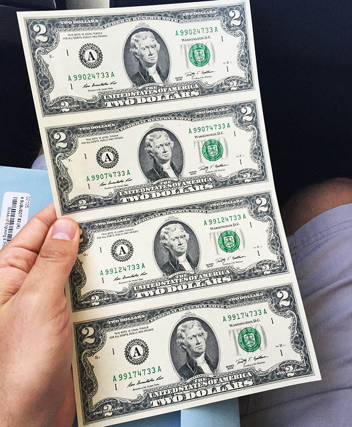 This is one of only two places in the country where paper money gets printed (the other is in Washington, DC). Photos here are scarce – in fact, I got yelled at by someone in the lobby of the Security building for even taking this picture of the sign from the road. Before we were allowed inside, all cell phones had to be left inside our car. But the inner workings of this building are fascinating! We took a 45-minute self-guided tour on an elevated catwalk that actually overlooks the factory floor, its machines, and the production staff. I paid $22.50 for an uncut sheet of four $2 bills at the gift shop. How about a few fun facts?