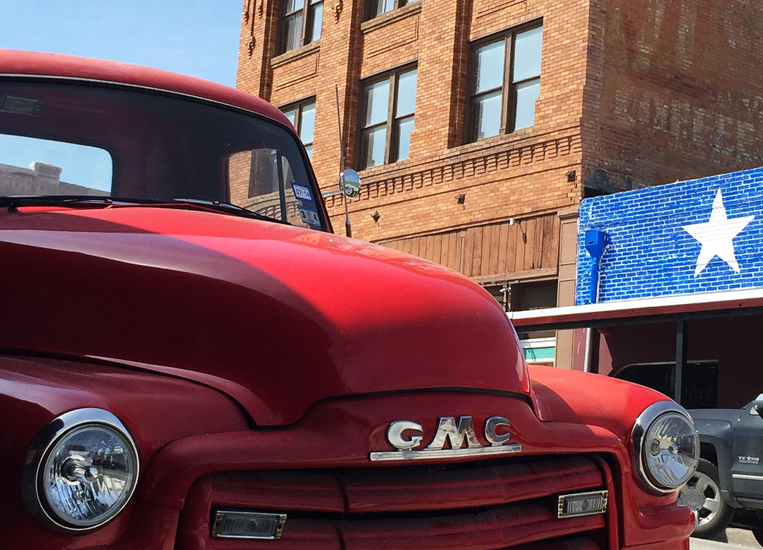 Crumbling building in Colorado City, Texas – and a dually pickup truck that is a perfect representation of the “typical” west Texas automobile of choice.