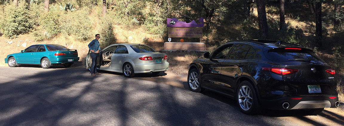 Saturday morning brought us crisp 45 degree temperatures and blue skies. I met up with Jason, James L, and James Z for a hearty Comfort Inn breakfast (complete with green chili on the side – total New Mexico thing!) and then we rallied our participants for this weekend’s drive: 2018 Alfa Romeo Stelvio, 2004 Mazda 6, and 1992 Acura Integra. It took only a few minutes to lose cell service as we headed north on twisty Highway 15. For only a 2-liter motor, the Alfa’s 280-horsepower 4-cylinder motor develops oodles of power and James was right on my tail. I swapped keys with Jason for a few miles and was impressed at how smoothly his (‘new‘) Mazda 6 handles given its 180k+ miles.