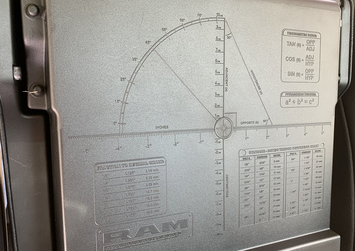 The underside of the center console has a mathematics reference grid, including the Pythagorean Theorem. Gotta love all the “Easter Eggs” that manufacturers sometimes hide for us to find!
