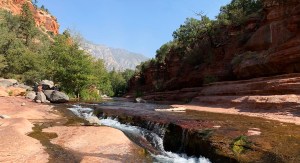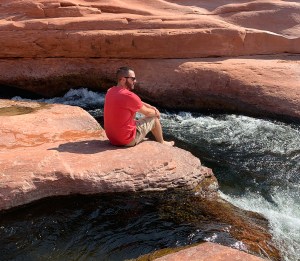 On Saturday, after breakfast at Indian Garden (I highly recommend the “ranchero bowl”), we went to Slide Rock State Park, a recreation area just a few miles up Highway 89A from where we were staying. The place gets its name from the slippery nature of the Oak Creek’s bed – after years and years of erosion making the surfaces smooth, coupled with mossy deposits, there is some great slipperiness to be enjoyed. We saw a few people tumble to a very wet riverbed in what looked to be painful experiences!